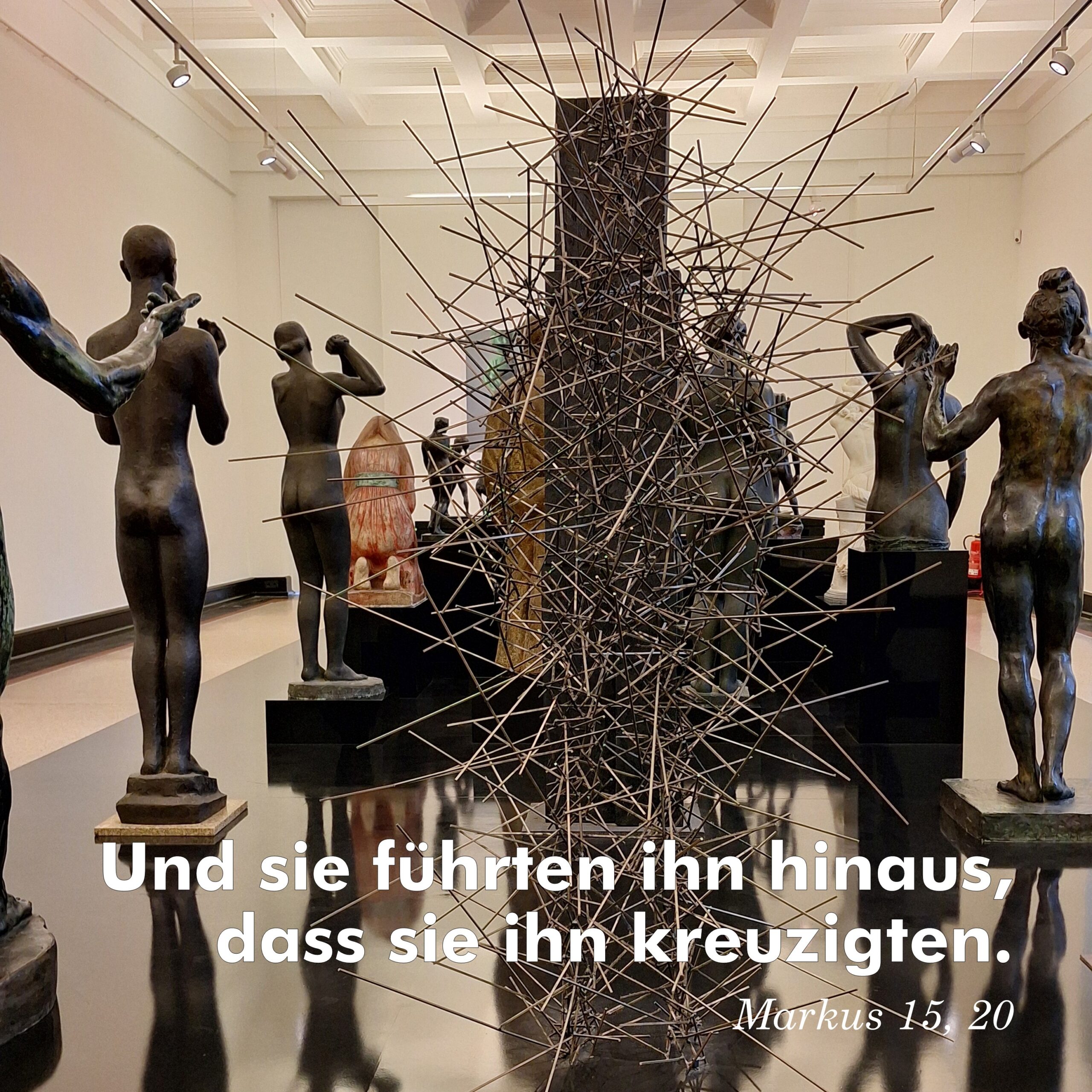In einem Saal der Kunsthalle Bremen sah ich viele verschiedene Plastiken in einem merkwürdigen Zug aufgereiht. Ich kann nicht sagen, was die Kuratoren der Kunsthalle mit diesem Zug aussagen wollten. Von hinten fotografiert, erinnert es mich an den Leidensweg Jesu durch die Straßen von Jerusalem – gegeißelt, verspottet, gekrönt mit einer Dornenkrone. Und die Schaulustigen erfreuen sich an fremdem Leid, ohne zu ahnen, was hier gerade Weltbewegendes geschieht.