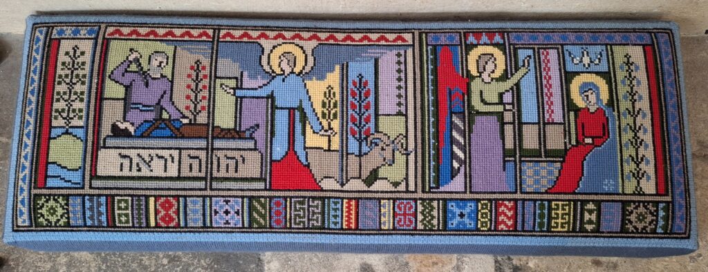 Warum nun die beiden Bilder auf einem Kniepolster? Ich habe keine abschließende Antwort. Es sind wichtige Szenen aus dem Alten und dem Neuen Testament. Die Verteilung der beiden Bilder auf dem Polster entspricht exakt dem Goldenen Schnitt, einem quasi göttlichen Verhältnis. Auf dem ersten Bild verbietet Gott die Opferung von Menschen zu seiner Ehre. Auf dem zweiten Bild sendet er seinen Sohn, der um der menschlichen Sünden willen leiden und sterben wird, wie ein Lamm zur Schlachtbank geführt wird.
