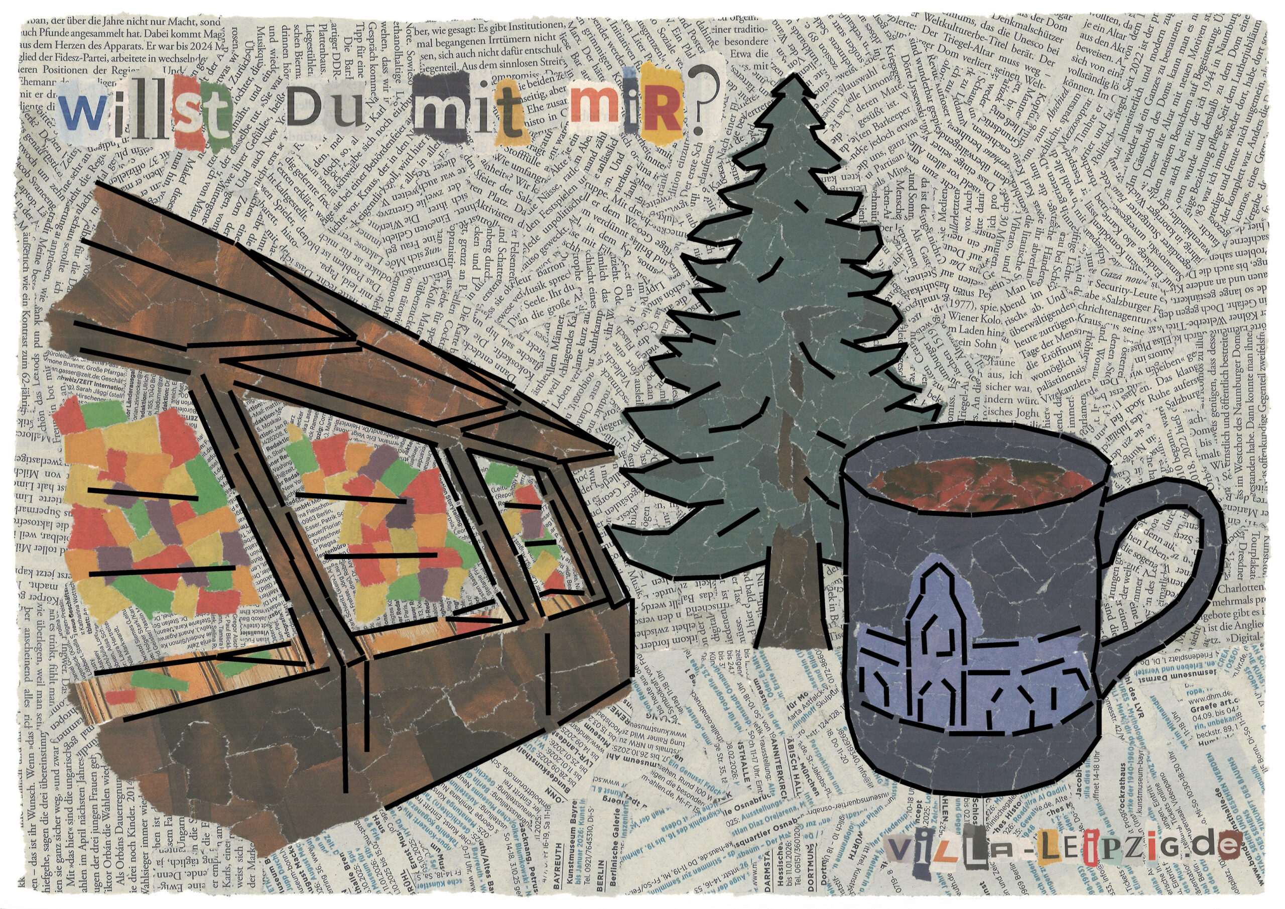 Während ich an meinem Kalender für 2026 gearbeitet habe, kam mir die Idee für ein Postkartenmotiv, um für Spenden für den VILLA e.V. zu werben. Die Karte liegt seit heute im Café der VILLA in der Lessingstr. 7 aus. Dort kann man mit einer kleinen Umfrage auch sein restliches Bargeld spenden.